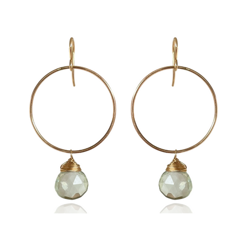 Une briolette enroulée de fil d’or, montée sur des boucles “U threaders” en gold filled 14 K : lignes épurées, mouvement léger, glow subtil.