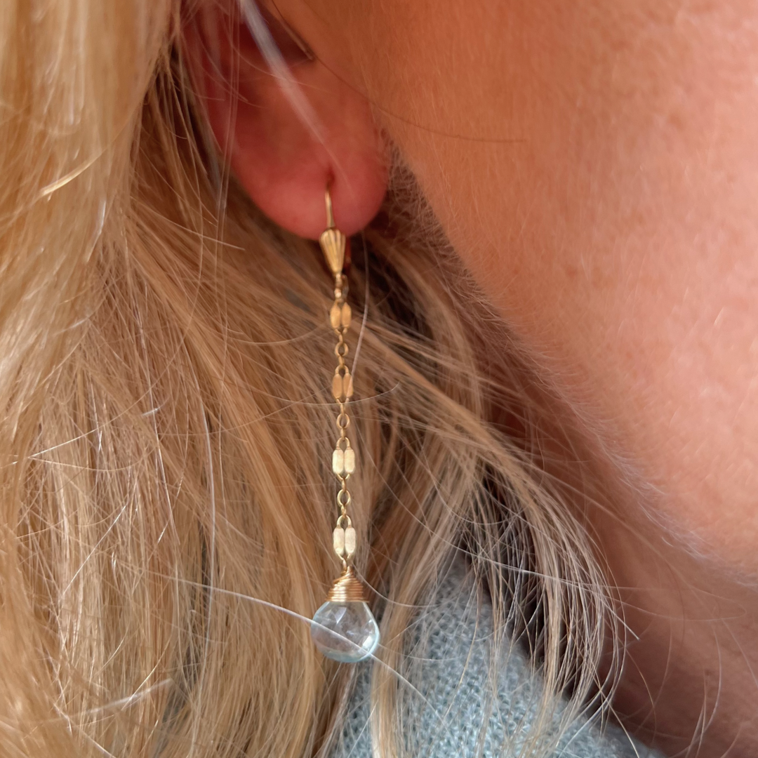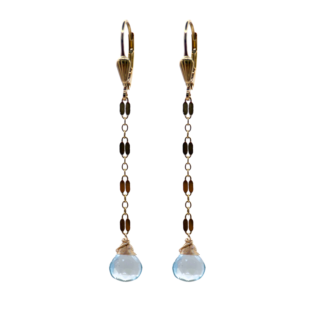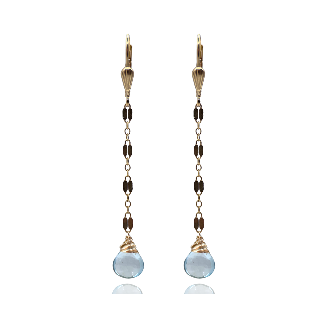 Élégantes et raffinées, ces boucles d'oreilles pendantes en aigue-marine sont montées sur une chaîne en gold-filled et dotées de fermoirs dormeuses pour un port confortable et sécurisé. La pierre d'aigue-marine facettée capte la lumière à chaque mouvement, ajoutant une touche délicate d’éclat naturel. Parfaites pour compléter toutes vos tenues, ces boucles d'oreilles sont un incontournable.