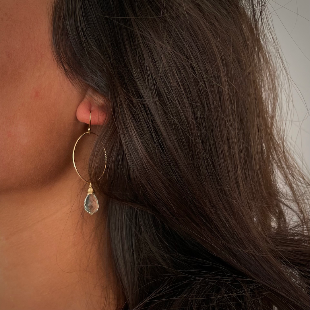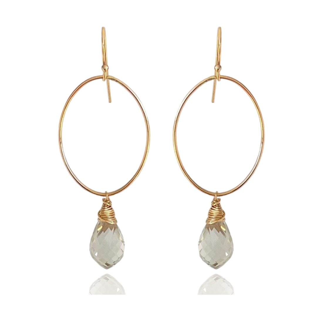 Ajoutez une touche d'élégance avec ces boucles d'oreilles pendantes, ornées d'une goutte pointue en améthyste verte micro-facettée. La forme allongée de la pierre apporte un éclat subtil et raffiné, tandis que les apprêts en gold filled assurent une finition durable et de qualité. Ces boucles d'oreilles allient simplicité et raffinement, parfaites pour toutes les occasions.