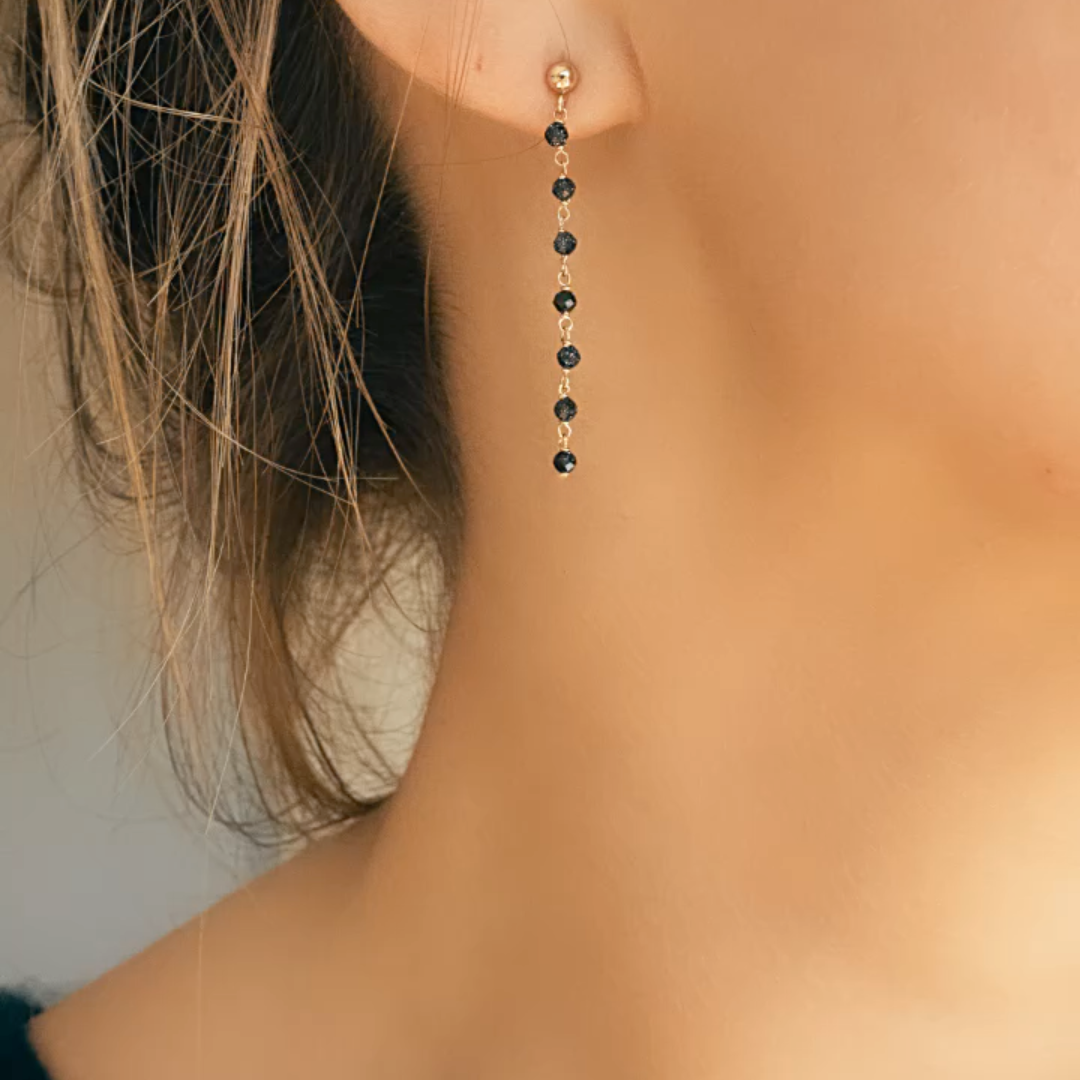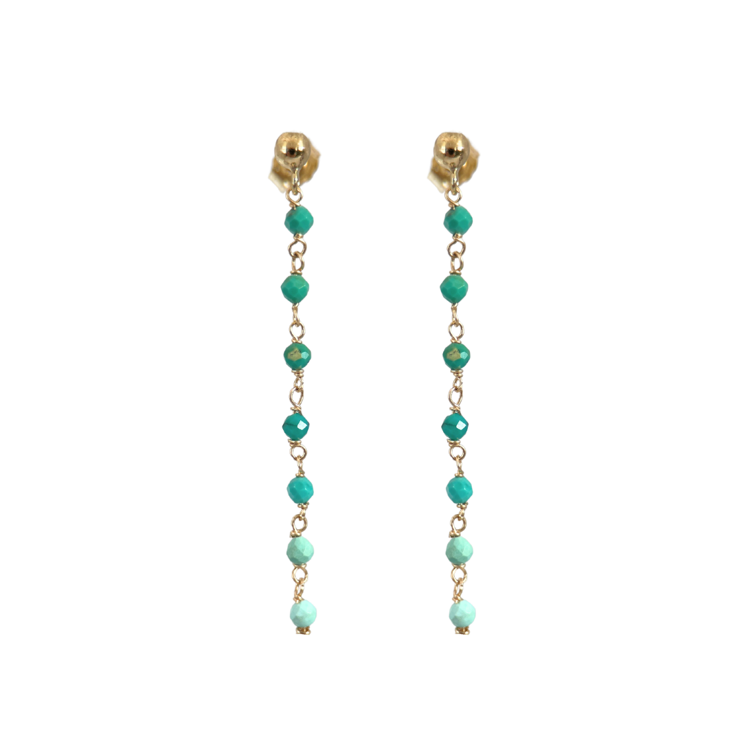 Ces boucles d'oreilles captivent par la beauté naturelle de petites pierres délicatement suspendues sur une chaîne de type rosary. La chaîne est fixée à un clou d'oreille gold-filled de 3 mm, offrant à la fois légèreté et raffinement.
