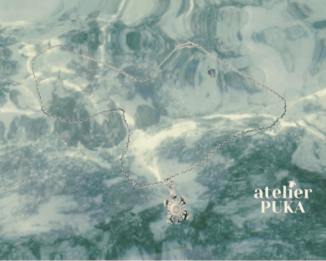 The Atelier PUKA logo echoes Emmanuelle’s love for Maui and her first jewel—a turtle necklace. From the start, a turtle became the house emblem: a quiet symbol of time, care, and strength, paired with the color of natural stones and refined gold-filled finishes, handcrafted in France with responsible intent.