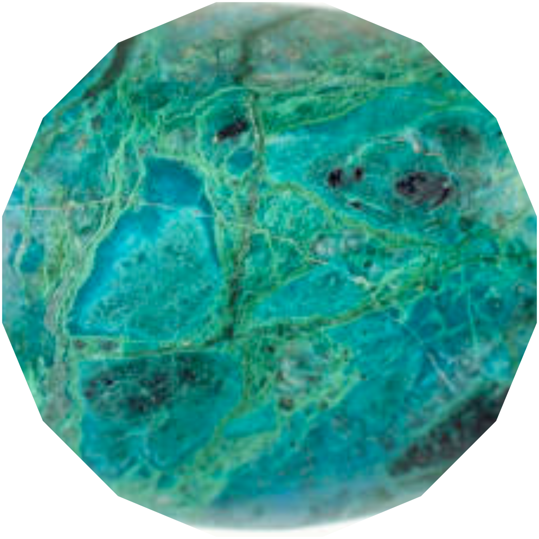 Chrysocolla is a copper-rich gemstone known for lagoon blues and sea-green tones, often marbled with darker veining or mingled with malachite. Its naturally silky, matte-to-satin finish gives a soft glow; when the material is more silicated, it takes a brighter polish while keeping that tranquil color.
