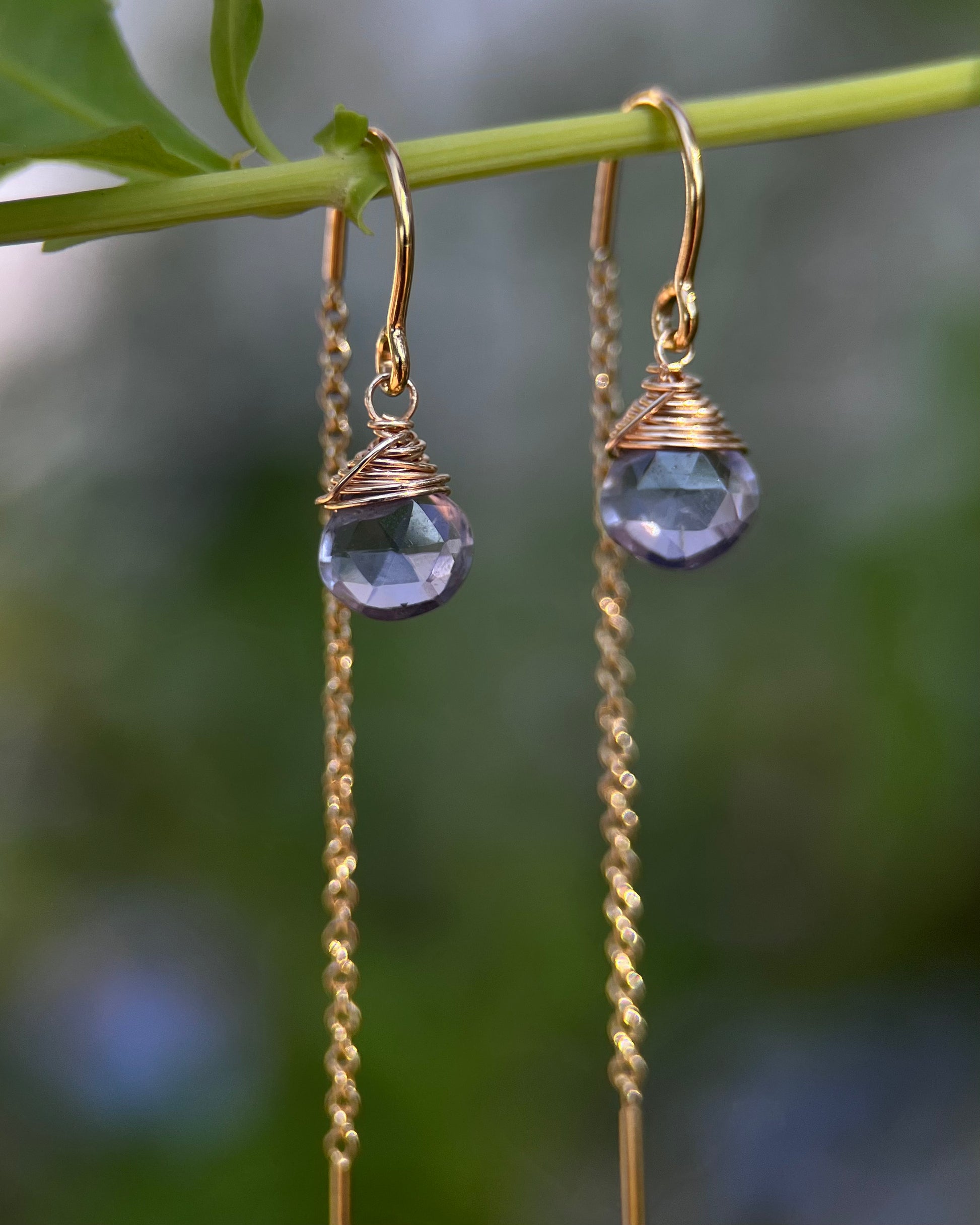 These minimalist earrings showcase the subtle sparkle of iolite, celebrated for its enchanting violet hues. The U-threader design imparts a sleek, contemporary silhouette, while the heart-shaped faceted stone enhances every movement with a refined glow. Ideal for those who seek understated elegance with a touch of shimmer, these earrings transition effortlessly from everyday wear to special occasions.
